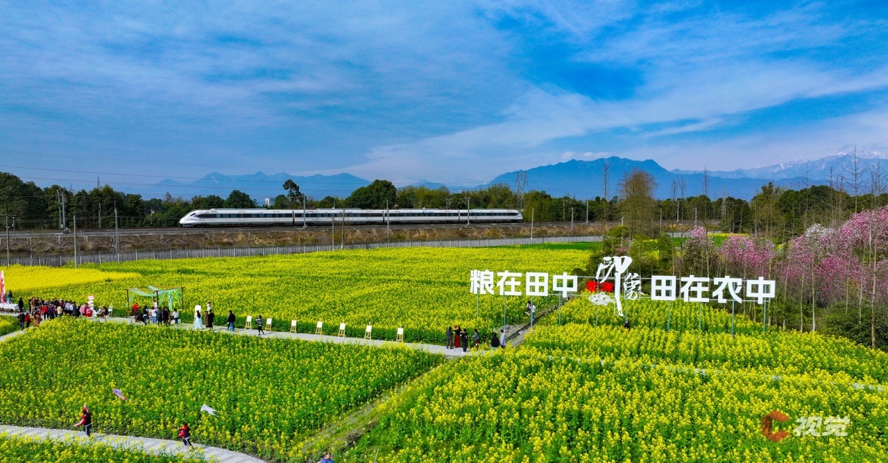 3月21日,都江堰聚源镇王家墩村,游人在花田里看雪山下的高铁飞驰。C视觉签约摄影师 邬宪初