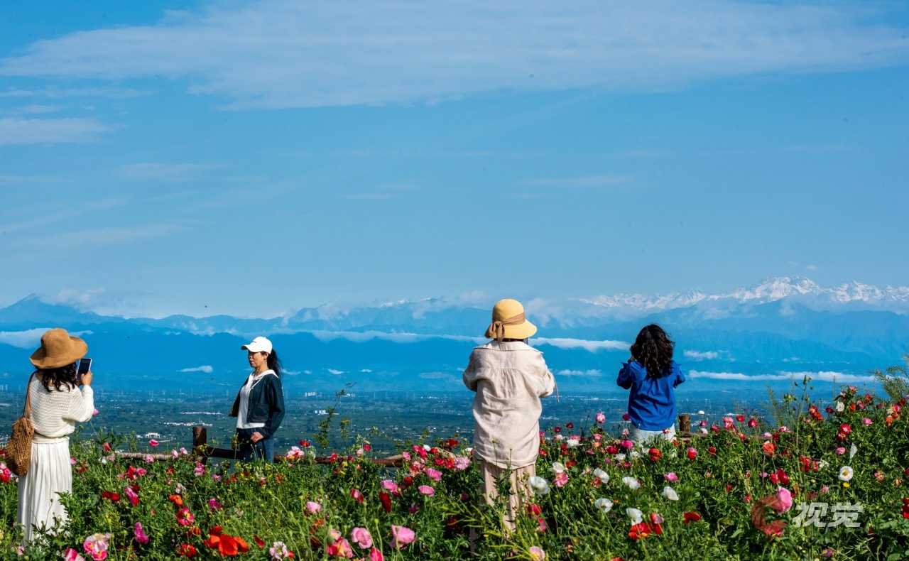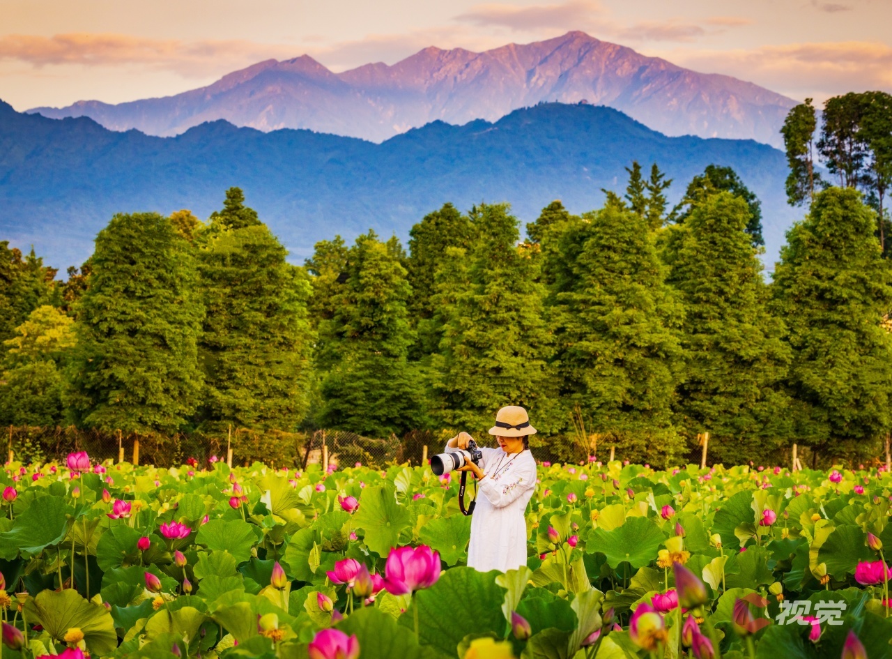 6月10日,在都江堰天马镇十里荷塘,游客定格雪山下的花海。C视觉签约摄影师 韦洪涛