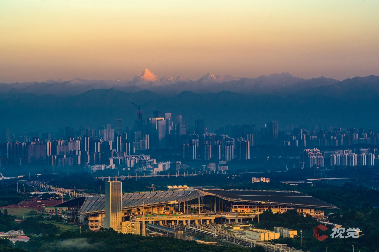 9月24日,建设中的天府高铁站与四姑娘山同框,日照金山辉映全城。C视觉签约摄影师田相和
