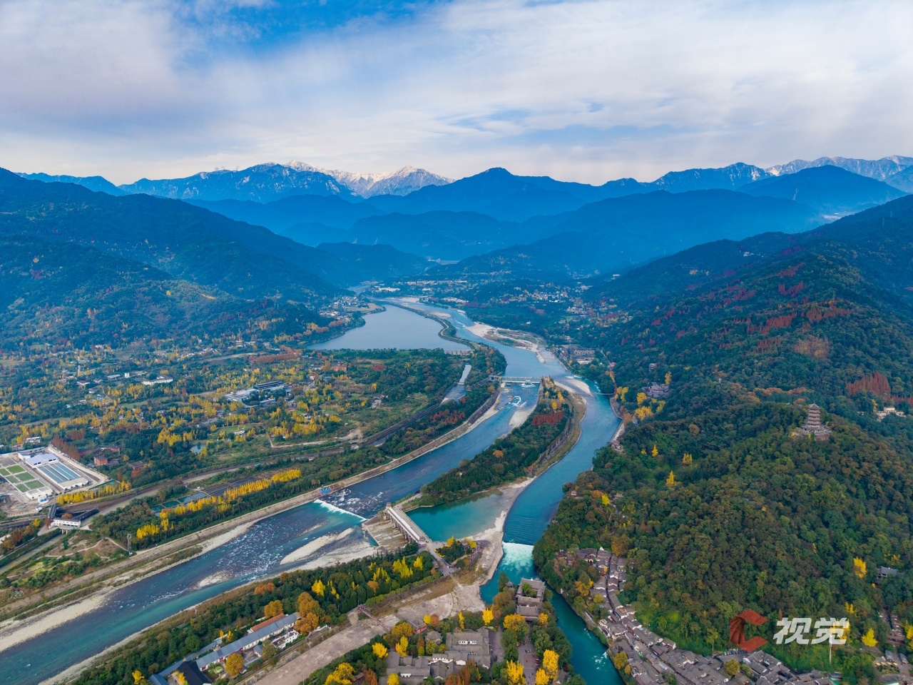 11月23日,世界文化遗产都江堰与雪山同框,斑斓彩林渲染出最美金秋。C视觉签约摄影师 周新联