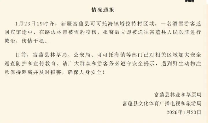 通报称,1月23日19时许,新疆富蕴县可可托海镇塔拉特村区域,一名滑雪游客返回宾馆途中,在路边林带被雪豹咬伤,报警后立即被送往富蕴县人民医院进行救治,伤情平稳。