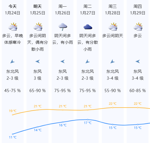 ▪ 今日(24日)多云,早晚体感寒冷;气温11-19℃;东北风2-3级;相对湿度45%-75%。