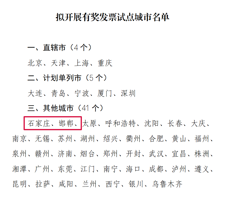 1月23日,商务部官网发布《拟开展有奖发票试点城市名单公示》。根据《财政部 商务部 税务总局关于开展有奖发票试点工作的通知》要求,商务部、财政部、税务总局于近期组织开展有奖发票试点城市评审工作。根据评审结果,拟确定50个城市开展有奖发票试点,河北省石家庄市、邯郸市入选。