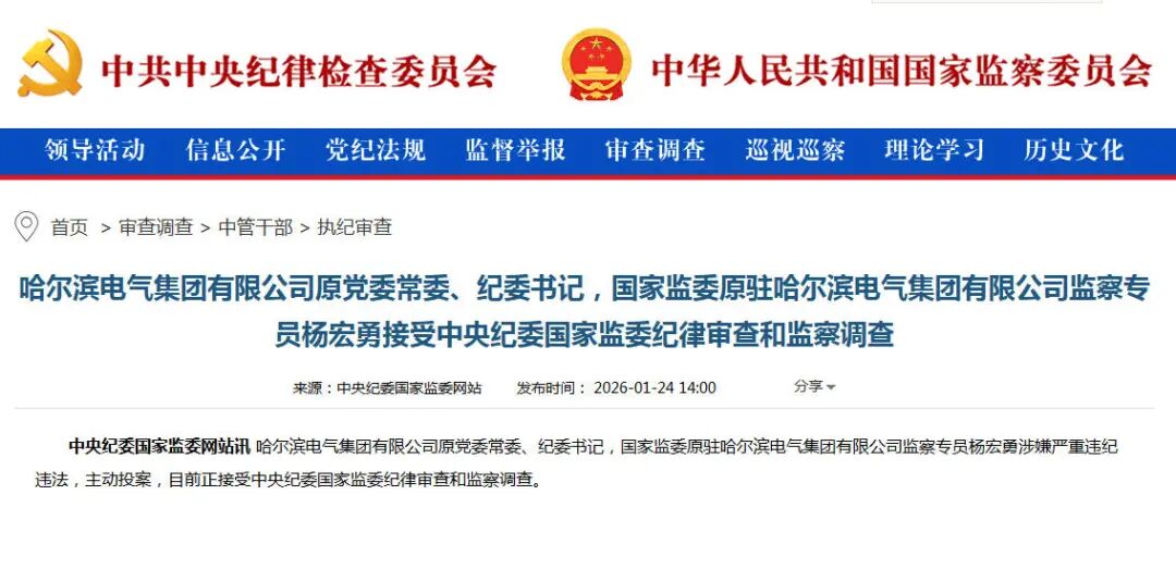 中央纪委国家监委网站1月24日消息,哈尔滨电气集团有限公司原党委常委、纪委书记,国家监委原驻哈尔滨电气集团有限公司监察专员杨宏勇涉嫌严重违纪违法,主动投案,目前正接受中央纪委国家监委纪律审查和监察调查。