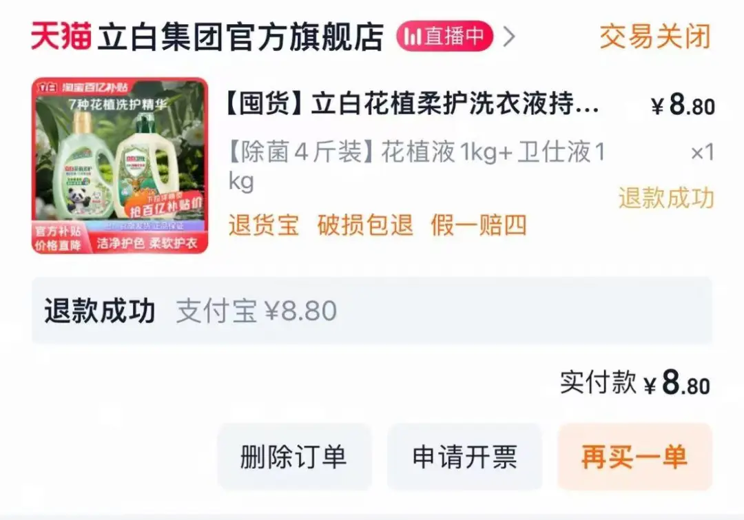 在社交平台上,还有消费者反映,错标价格的产品还有立白花植柔护洗衣液(除菌4斤装),标价8.8元,该订单也被官方退款。