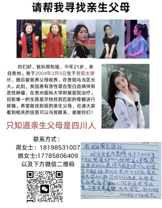 找到小瑶的亲生父母或兄弟姐妹进行配型,是眼下最佳的途径。然而,线索仅有当年亲生父母留在女儿襁褓中,一封泛黄手写的信。信文透露,小瑶2004年2月9日生于贵州太慈桥,写下这封信的亲生父母自称四川人,“回家交不起钱,所以才将此女抱出,实在是不忍心……”。