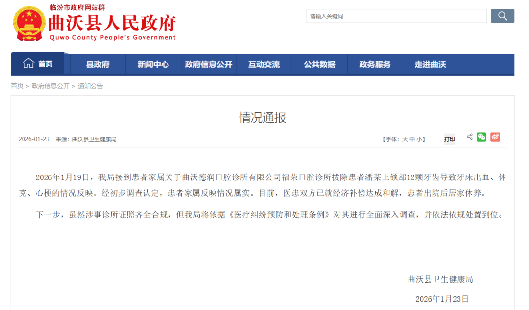 1月19日,我局接到患者家属关于曲沃德润口腔诊所有限公司福荣口腔诊所拔除患者潘某上颌部12颗牙齿导致牙床出血、休克、心梗的情况反映。经初步调查认定,患者家属反映情况属实。目前,医患双方已就经济补偿达成和解,患者出院后居家休养。
