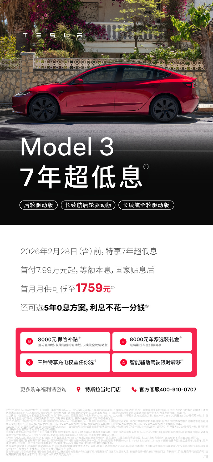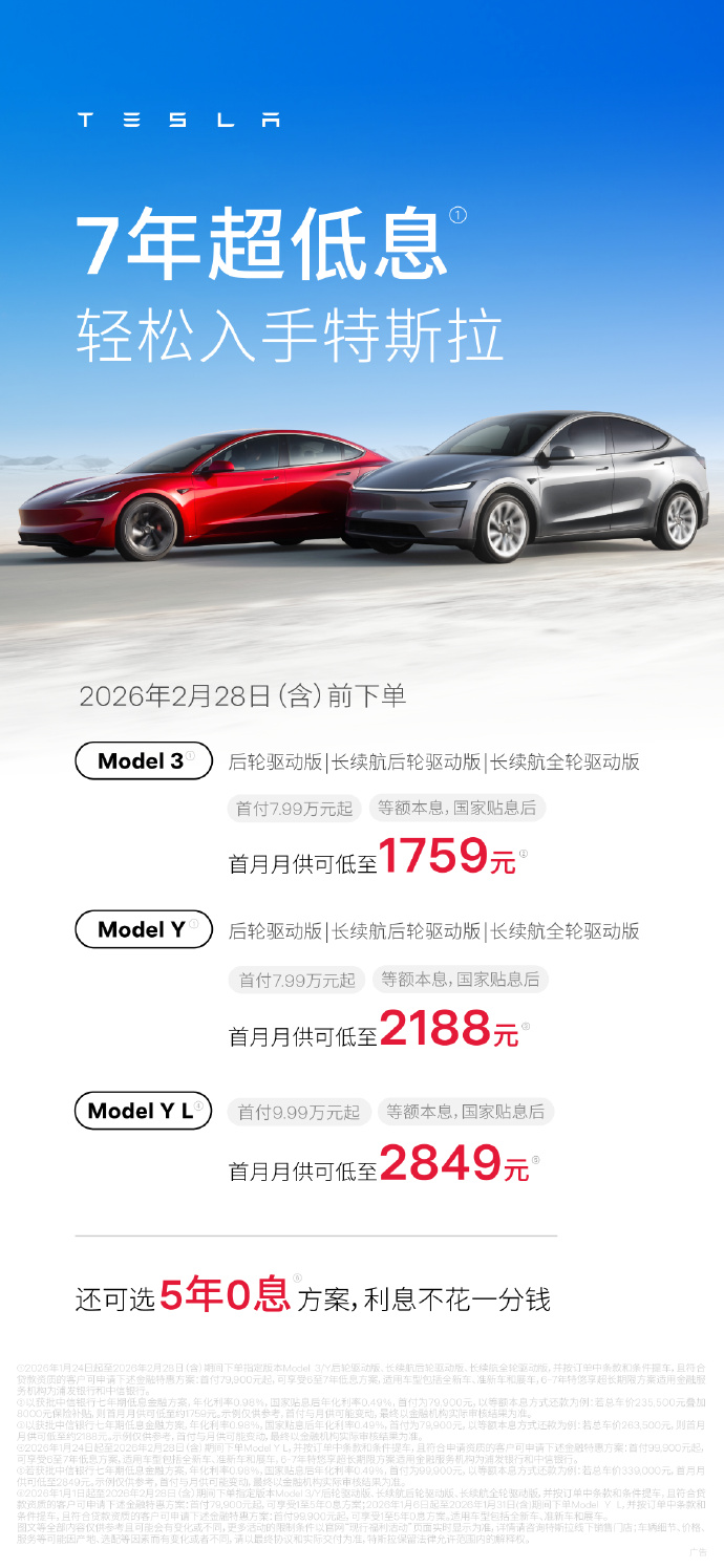 其中,Model 3首付7.99万元起,月供可低至1918元;Model Y首付7.99万元起,月供可低至2263元;Model Y L首付9.99万元起,月供可低至2947元。