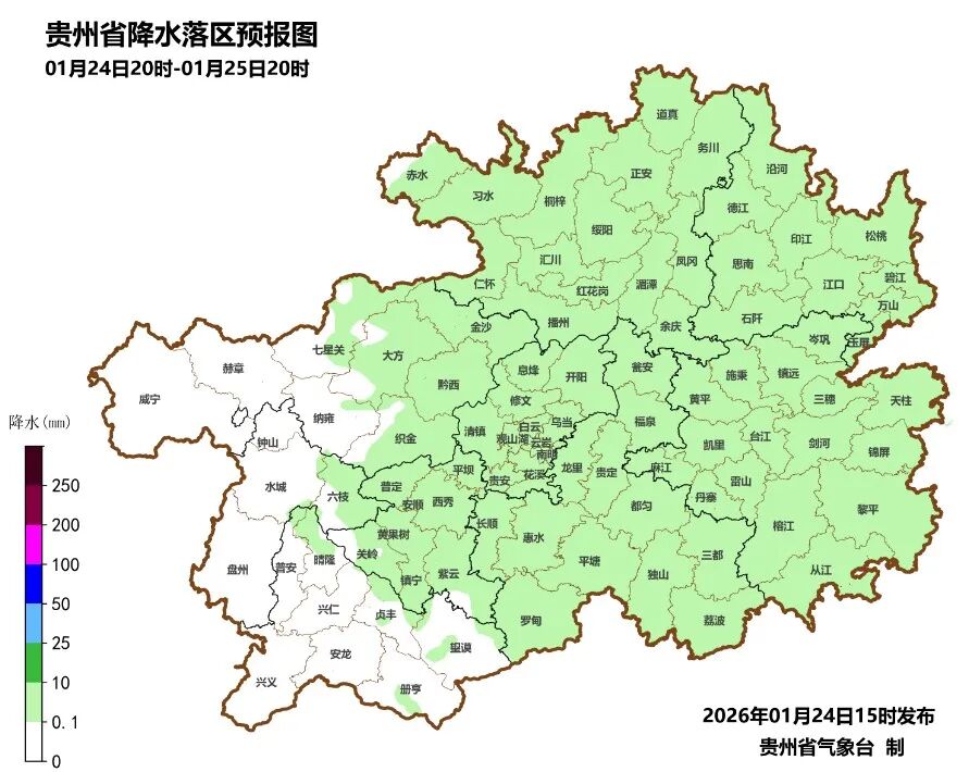 25日夜间到26日白天,贵州西部边缘多云转阴天有零星小雨,西北部地势高处有零星冻雨,其余地区阴天有小雨,中西部夜间到早晨局地有雾;