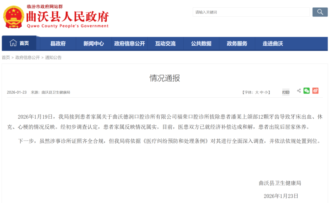 1月23日,山西临汾曲沃县卫生健康局就“女子被一次性拔12颗牙休克心梗”发布情况通报。