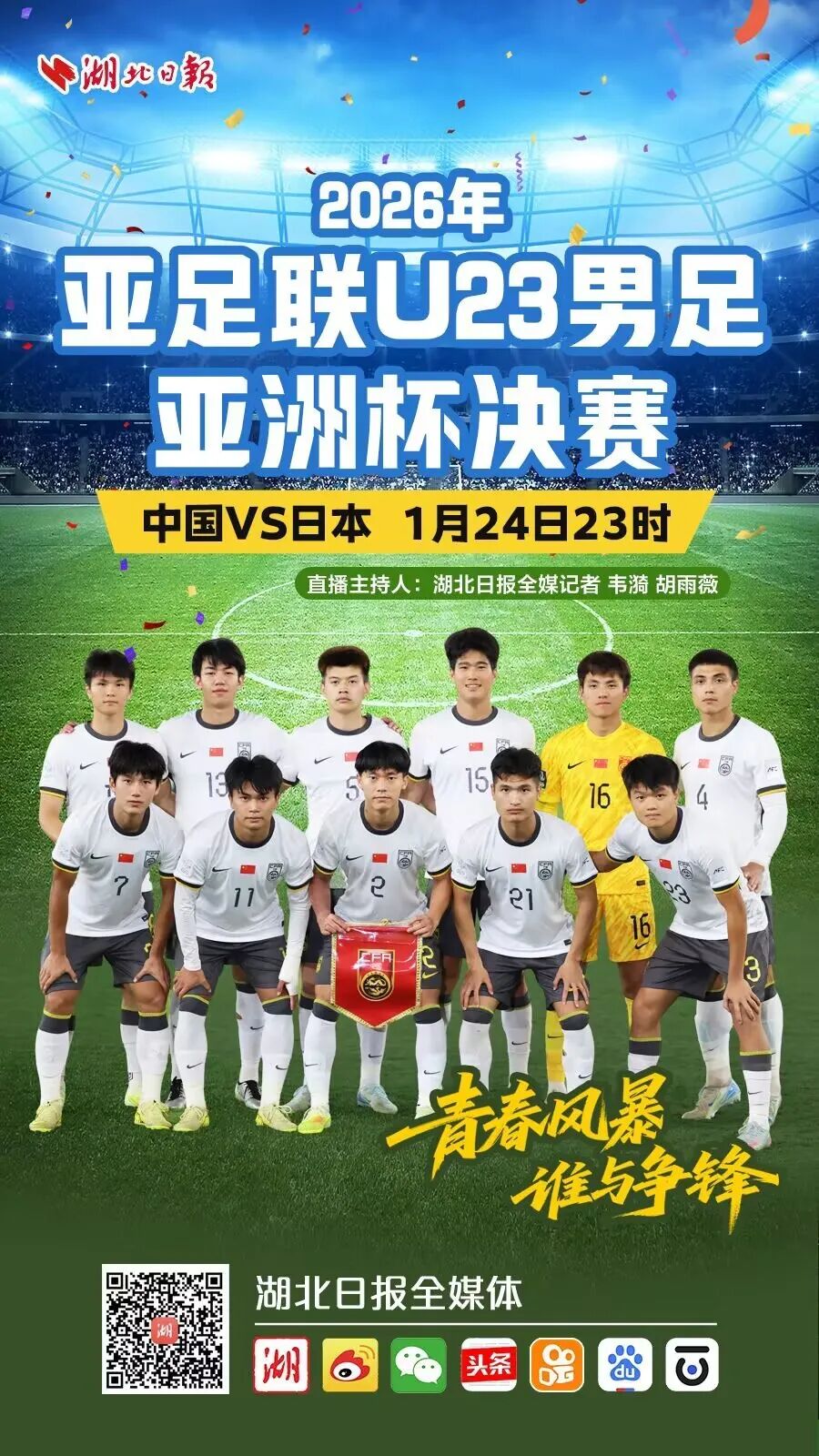 今晚(24日)11时,U23男足亚洲杯决赛,中国队将迎战日本队。冠军之战即刻打响。