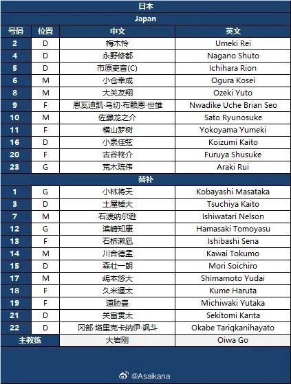 日本U23替补:1-小林将天、12-滨崎知康、3-土屋櫂大、7-⽯渡尼尔森、13-石桥濑凪、14-川合德孟、15-森壮一朗、17-嶋本悠⼤、18-久⽶遥太、19-道协丰、21-关富贯太、22-冈部飒斗