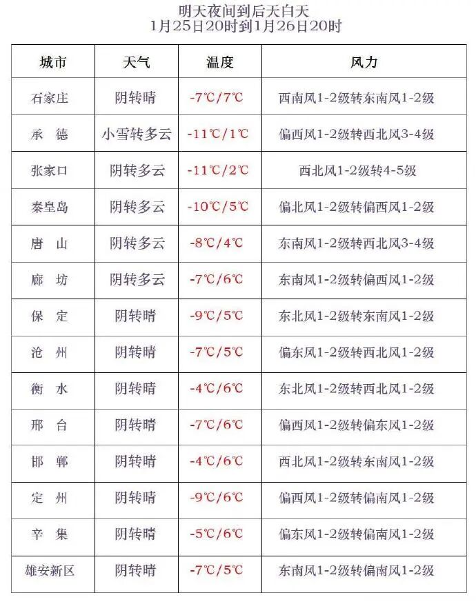明天夜间到26日,全省阴转晴,其中保定、廊坊以北地区有小雪或零星小雪。