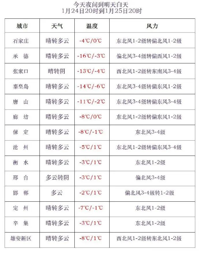 今天傍晚到夜间,石家庄、邢台和邯郸三个地区的西部晴转阴,其他地区晴间多云。渤海海域和沿海地区有东到东北风5到6级,阵风7级。最低气温,张家口北部、承德-31~-16℃,其他地区-15~-1℃。