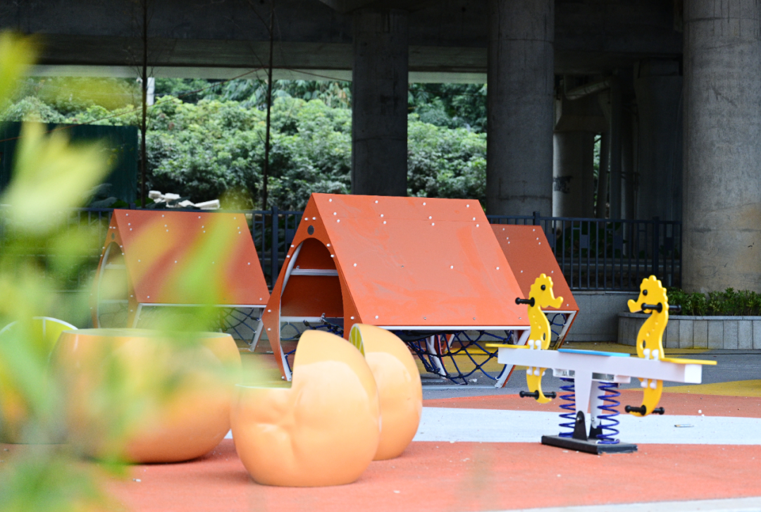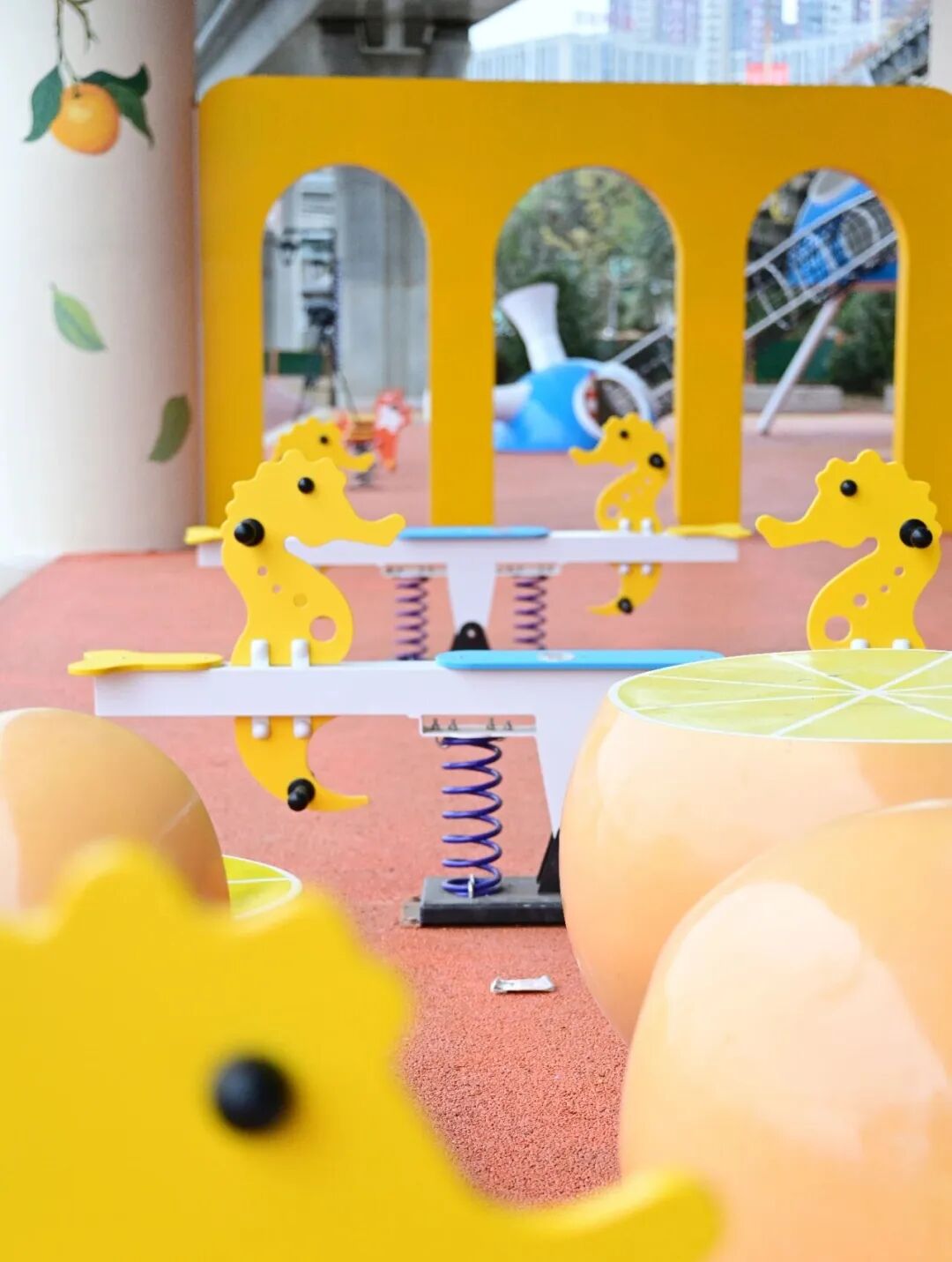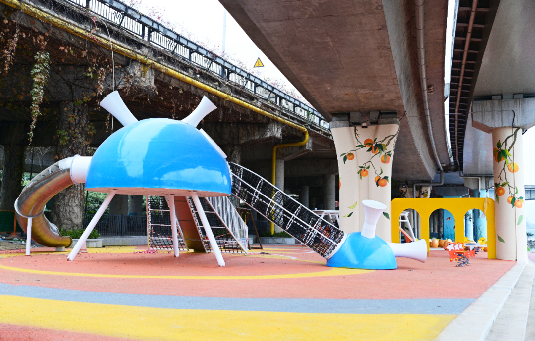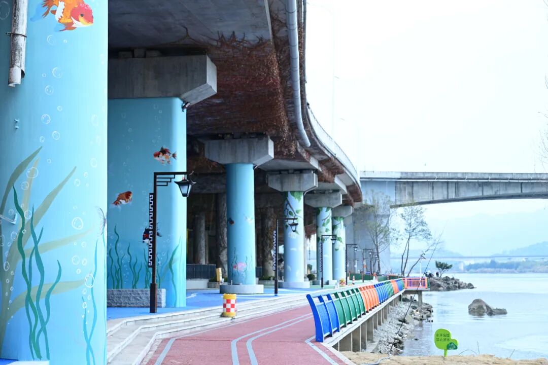 项目现场,原本单调的桥墩披上了精心绘制的“新衣”,金鱼、橙子等鲜活灵动的图案栩栩如生,为硬朗的建筑增添了几分暖意与童趣;色彩鲜艳、种类丰富的儿童娱乐设施已安装到位,工人正在忙着养护绿植。