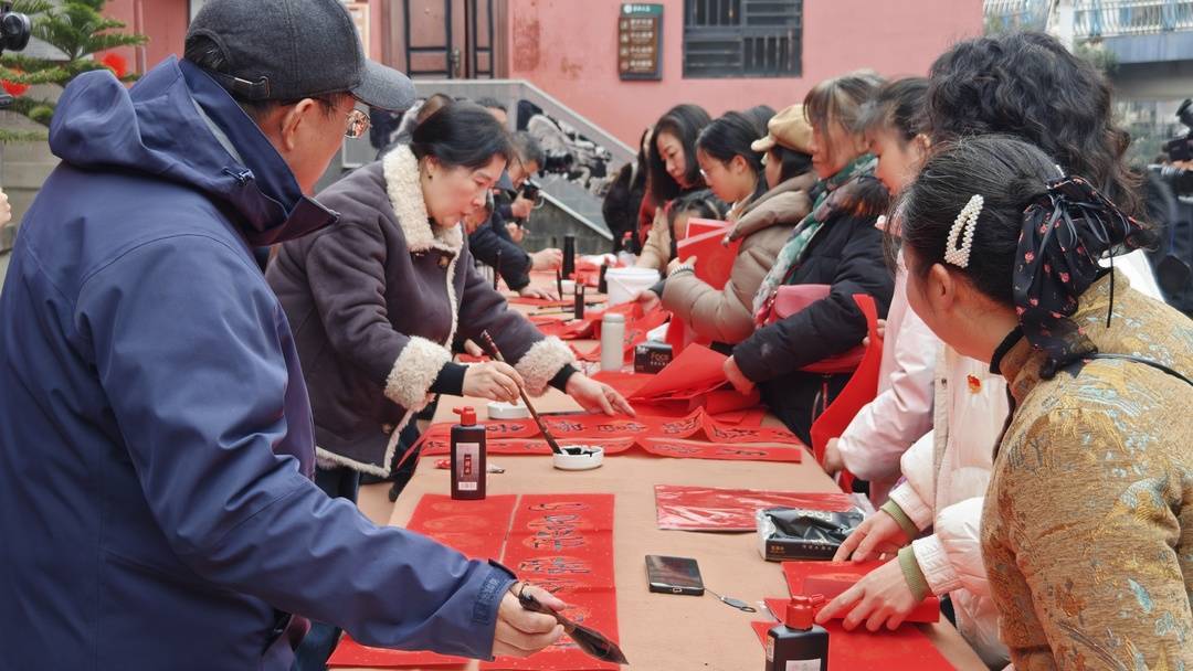 另一边,电影院对面的渠县文庙外,“艺术走基层 翰墨润賨都”——四川省“优质文艺资源直达基层”活动也如火如荼地展开,四川省多位书画艺术家宫墙下以笔传情,一幅幅春联、一个个福字,为现场增添了满满的年味。多个村、社区基层党组织带领群众有序领春联、接福字,沉浸式感受“福美渠县”的美好与祝福。