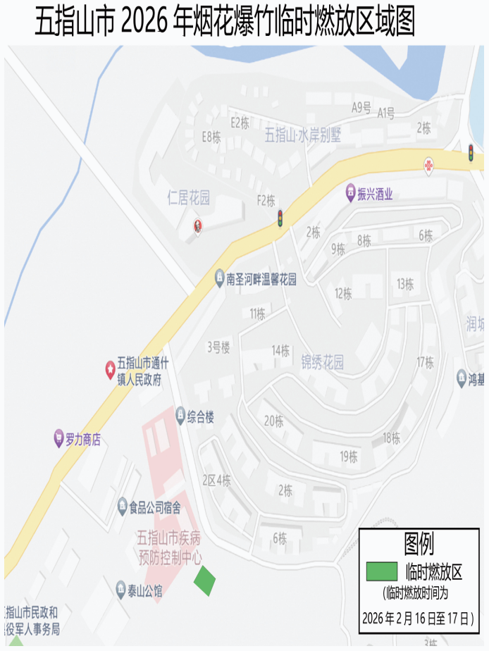 五指山市城区设置的临时燃放点在五指山市锦绣花园小区二期后面的空地处(五指山市翠林路),临时燃放时间为2026年2月16日至2月17日两天,其余时间五指山市主城区不再划定燃放区域。