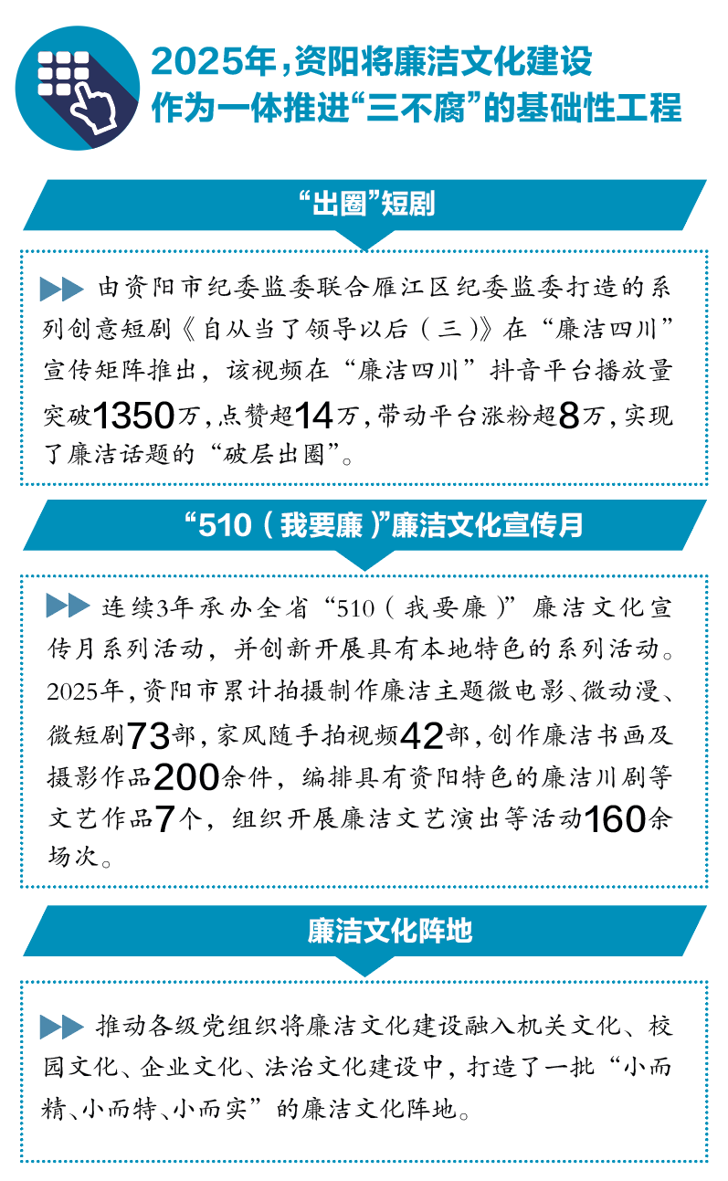 从创意短剧刷屏网络到清廉活动浸润人心,从本土品牌持续擦亮到家风建设走深走实,资阳市正以文化为桥、以教育为基,让廉洁文化融入日常、浸润人心,为一体推进“三不腐”筑牢思想根基,为经济社会高质量发展营造风清气正的政治生态。