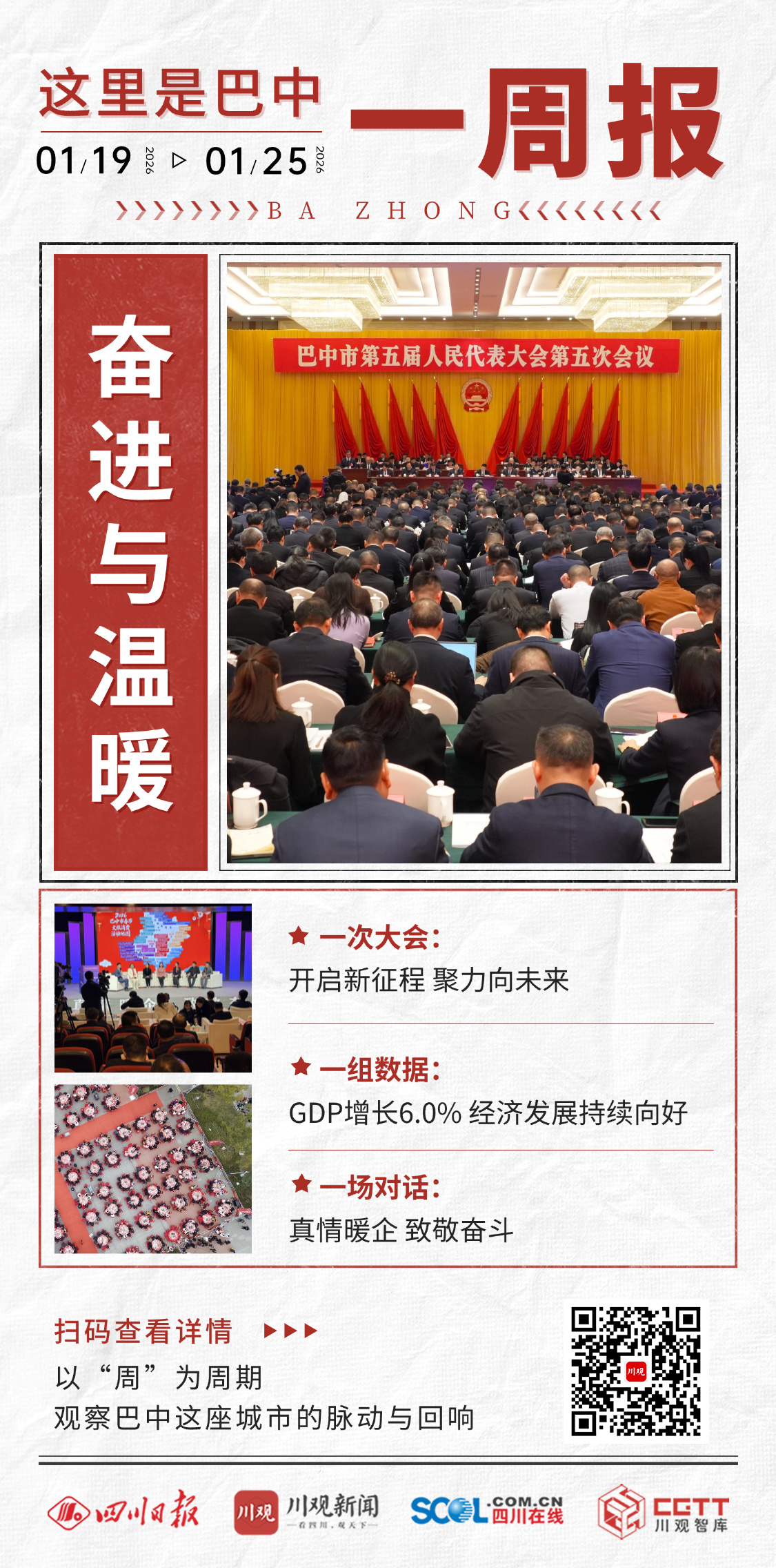 1月19日至25日,是今年的第三周。这一周里,巴城雨雪交替,气候寒冷,但奋进与温暖却是这座老区城市的主基调。市两会是本周巴中主要工作,政府工作报告中第1、首个、前列等关键词,折射出巴中的发展脉络。2025年巴中经济形势也于本周发布,2025年巴中地区生产总值916.64亿元,比上年增长6.0%,“总量争千亿”的开局目标近在眼前。此外,巴城还举行了一场以“真情暖企 致敬奋斗”为主题的企业家幸福感营商对话,在寒冷的季节里,巴城企业家们却倍感温暖。