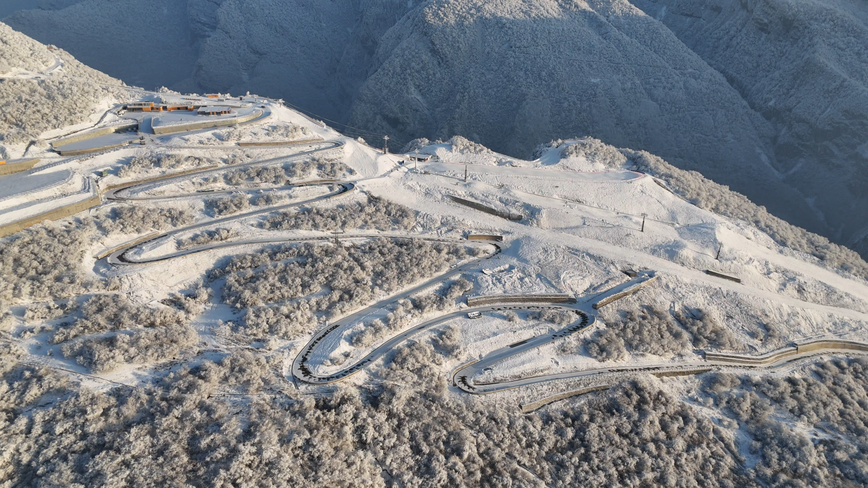 雪后通往虎牙滑雪场蜿蜒的山路