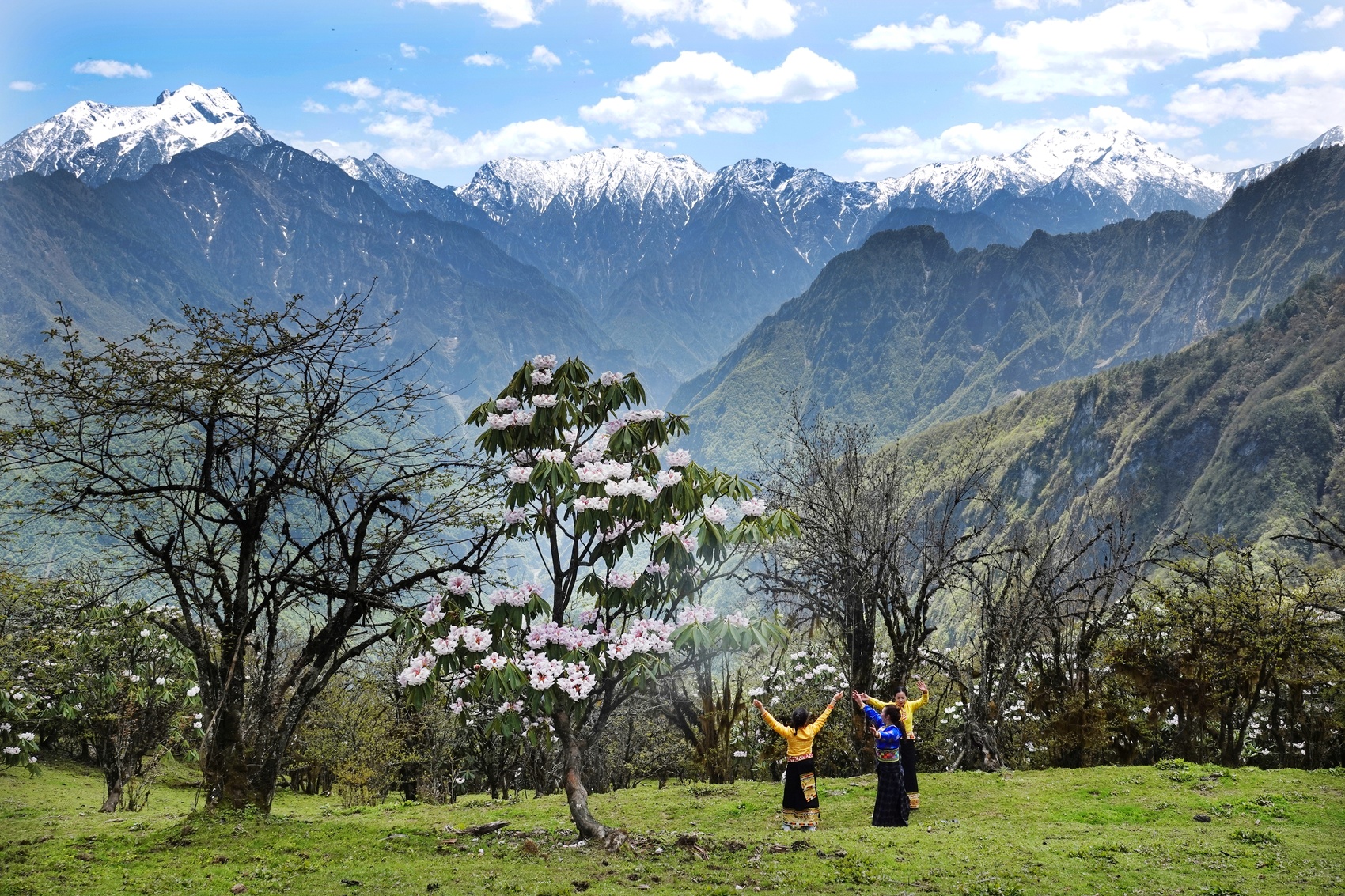在雪山映衬的杜鹃花树下,游客正悠然起舞 胡宇摄