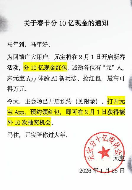 今天(1月25日),腾讯官方发布通知:将于2月1日上线春节活动,用户上元宝App分10亿现金红包,单个红包金额最高可达万元。