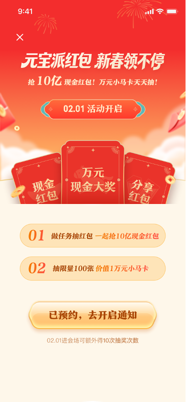 1月25日起,用户将元宝App更新到最新版本(2.55.0以上),点击主页的预约卡片即可进入“春节会场”预约页面。提前预约的用户将在2月1日活动开启当天,额外获得10次抽奖次数。