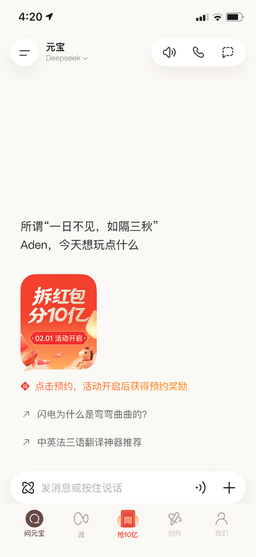 活动背后,腾讯正在酝酿AI大招。据腾讯内部人士透露,元宝即将上线全新玩法,并已开启内测邀约。官方公布的产品界面图中已悄然新增一个名为“派”的入口。
