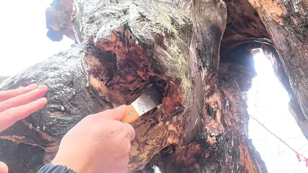 记者在现场观察到,树干中最大的一个枯桩经过清理后,内部显露出坚硬的木质结构,边缘被仔细打磨成平滑的弧面,显现出古朴的光泽。