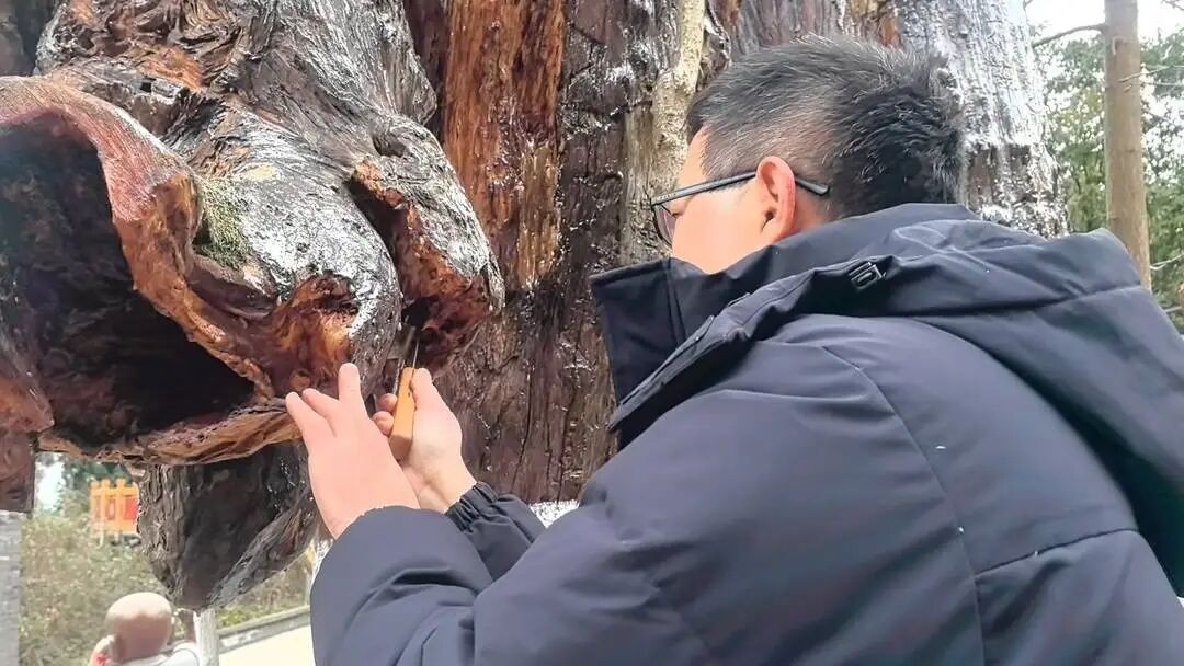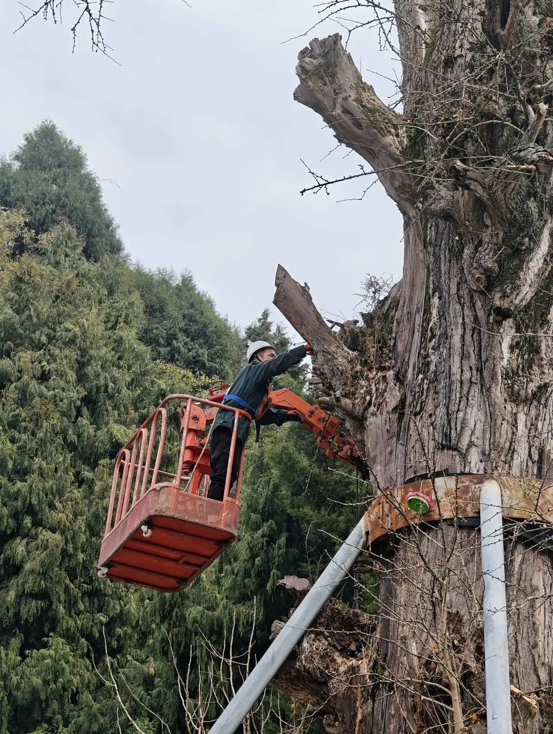 经过近一个月的精细作业,技术人员使用特制刮刀和软轴抛光机,像考古学家清理文物般,一层层去除腐烂组织,并对空洞进行树脂填充,随后涂抹防水防腐剂,既防止病虫侵入,又保留古树苍老的历史形态。