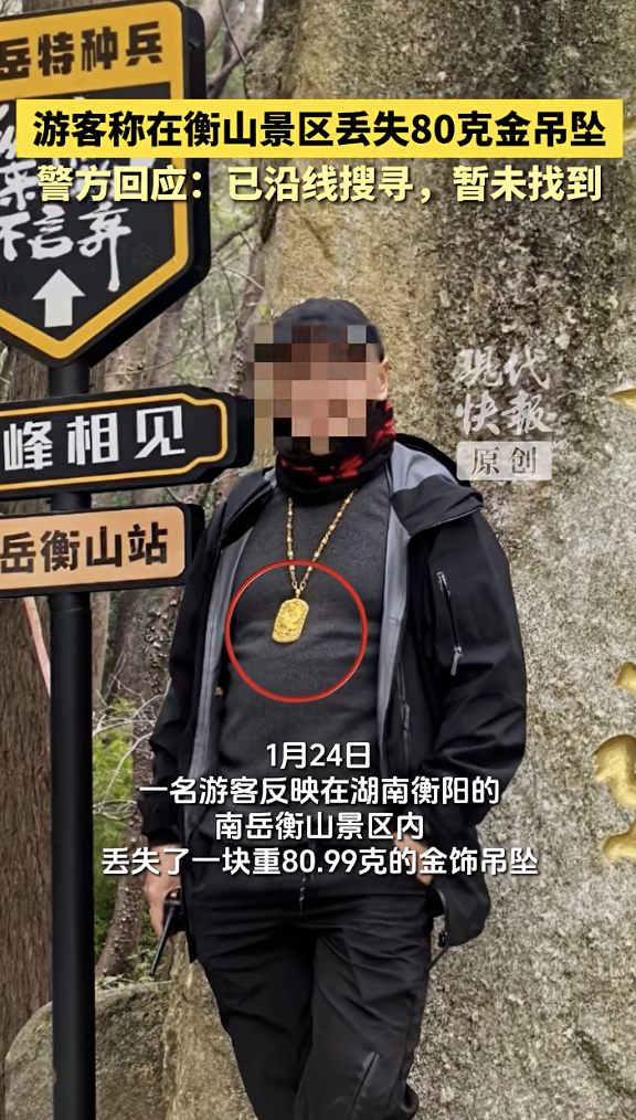 1月24日,一名游客称在湖南衡阳的南岳衡山景区内,丢失了一块重80.99克的金饰吊坠。1月25日,现代快报记者从衡阳市公安局南岳分局半山亭派出所了解到,警方已接到相关报警,目前仍在继续搜寻。