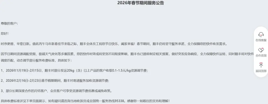 顺丰公告称,因节日期间资源调配受限、极端天气变化等多重因素,快件时效或将受到不同程度影响,将对快件和资源灵活调度匹配,动态调节部分服务收费标准。其中:2026年1月19日-2月15日,顺丰对部分发运20kg(含)以上产品的客户收取0.1-1.5元/kg资源调节费;2026年2月16日-2月23日春节假期期间,顺丰对寄递服务加收资源调节费。部分长期深度合作的月结客户、会员客户可享受资源调节费优惠或减免政策。