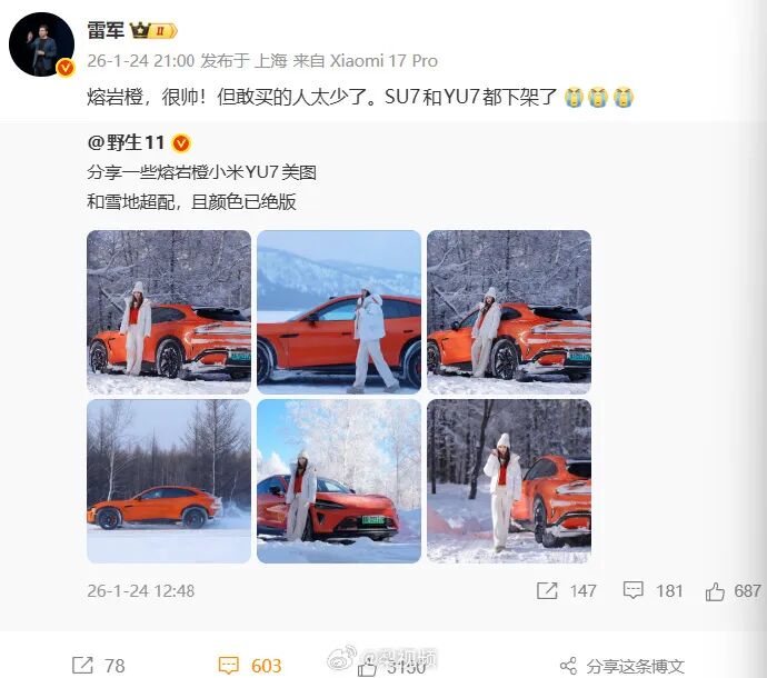 雷军表示,目前小米SU7和YU7都下架了熔岩橙配色。雷军还在评论区里称:“一款车漆,好看而且大家都敢买,实在太难。”