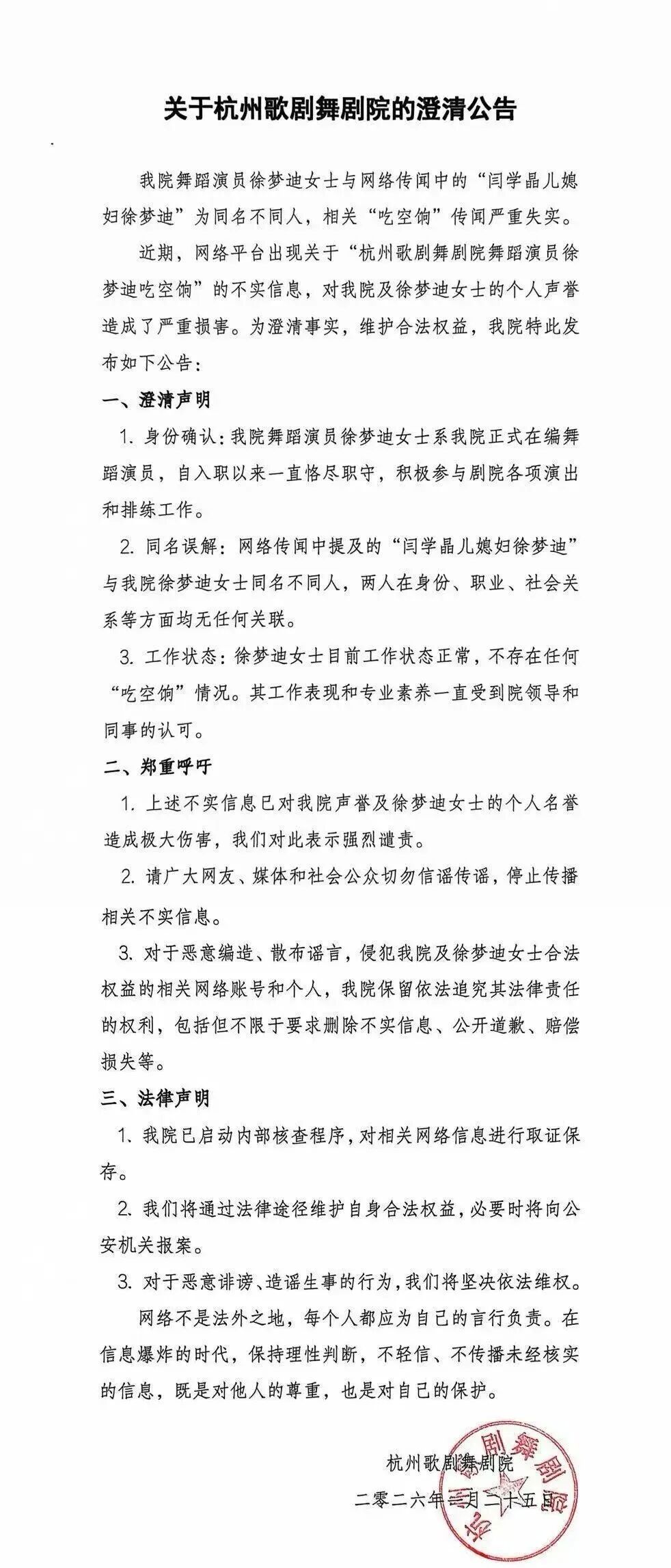 1月25日,杭州歌剧舞剧院发布澄清公告称,该院舞蹈演员徐梦迪女士与网络传闻中的“闫学晶儿媳妇徐梦迪”为同名不同人,相关“吃空饷”传闻严重失实。公告详情如下: