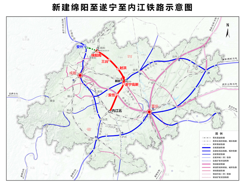 绵遂内铁路项目全线总长287.9公里,预计2030年全线建成通车,线路以绵阳站为起点,终至内江北站,贯穿绵阳、德阳、遂宁、资阳、内江五市共11个县级行政区,项目已列入国家《中长期铁路网规划》及成渝地区双城经济圈轨道交通专项规划。项目建成通车后,将结束三台县、射洪市不通铁路的历史,进一步完善川北、川南、川中区域城际铁路环线,对于促进沿线区域社会经济发展,加快推动成渝地区双城经济圈综合交通运输体系建设具有重大意义。其中,绵遂段已于2024年8月开工,计划2028年通车。