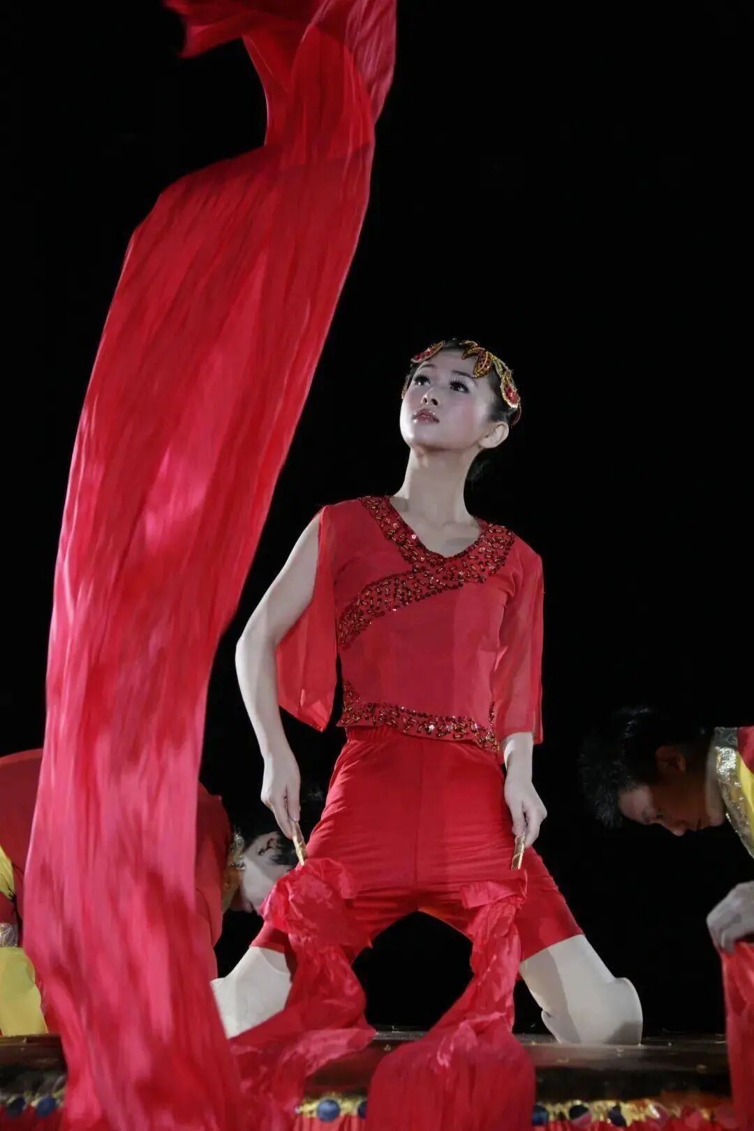 截肢后的廖智身着一袭红衣舞裙,跪立在红色鼓面上,演绎《鼓舞》。资料图