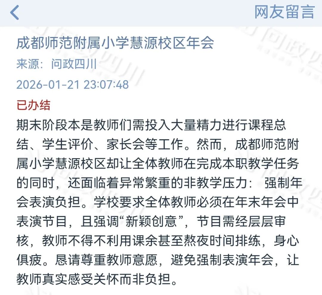 今天(1月25日),当地教育局发布情况通报回应此事。通报称,经核实,该校原计划期末召开学期总结会,拟在育人故事分享环节组织教师进行多种形式展示交流,引发教师不满。区教育局已于1月22日责成学校立即取消育人故事分享环节,当日通知全体教师,并向投诉人告知处理结果获理解。