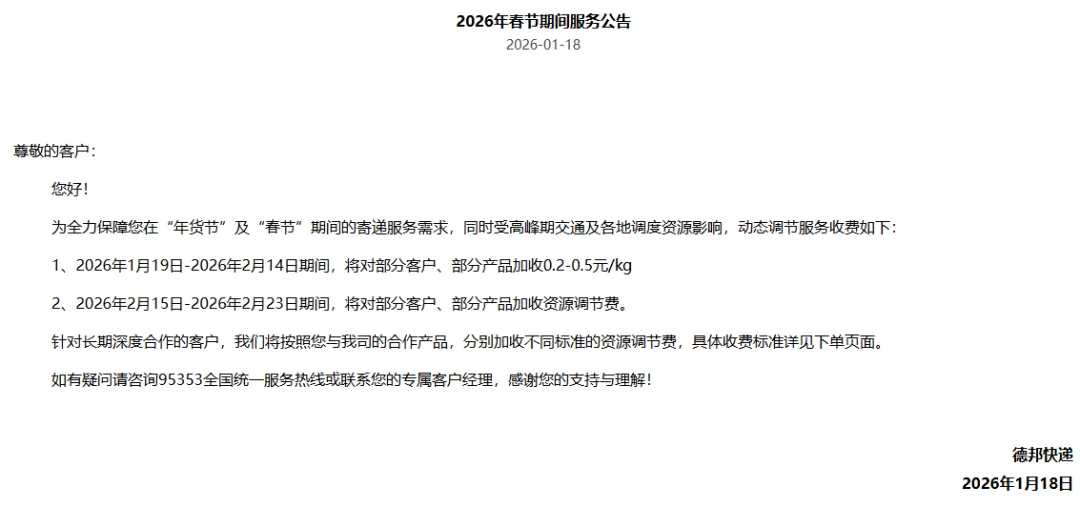 在2026年1月19日-2026年2月23日期间,将在特快重货产品原价格基础上加收0.1-1.2元/kg的高峰期资源调节费。