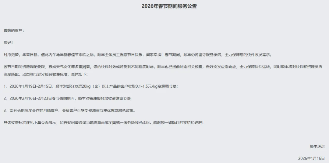2、2026年2月16日-2月23日春节假期期间,顺丰对寄递服务加收资源调节费;
