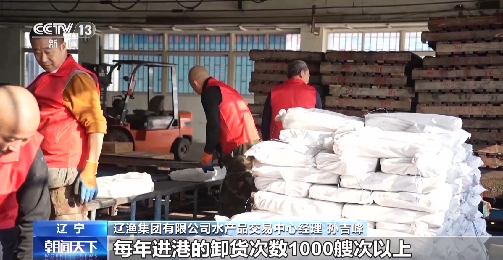 辽渔集团有限公司水产品交易中心经理 孙吉峰:渔船有来自辽宁、山东、天津、河北的,每年进港的卸货次数1000艘次以上,每年的交易量在10万吨,交易额在7.5亿元左右。