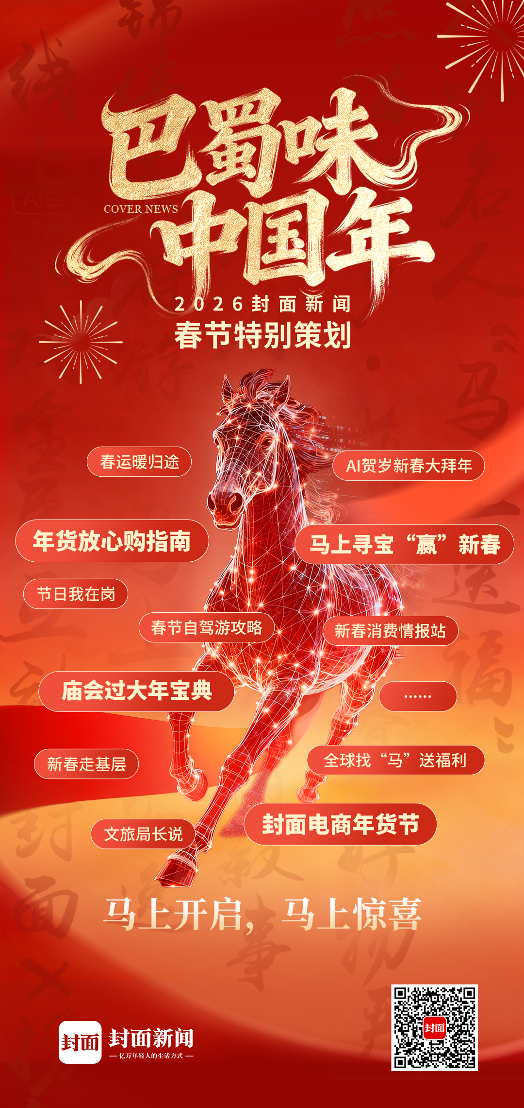 今天起,“巴蜀味 中国年”封面新闻2026春节特别策划正式启动,在这里,我们将以多种报道形式,带你第一视角捕捉年味烟火气;以官方权威解读,为你提供“可看、可感、可用”的出游指南;以趣味互动游戏,让你打破时空界限“马上过年”。