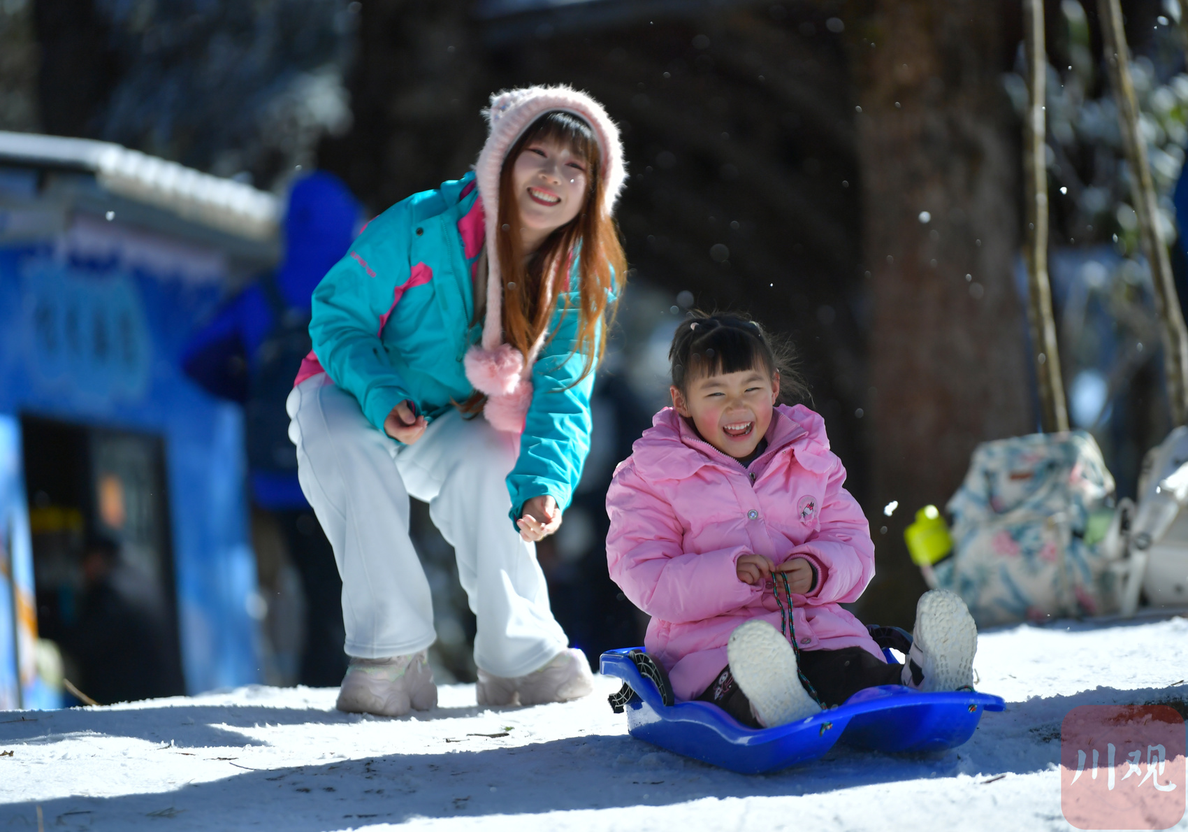 1月9日,游客带着孩子在眉山市洪雅县瓦屋山景区的雪地里玩耍。