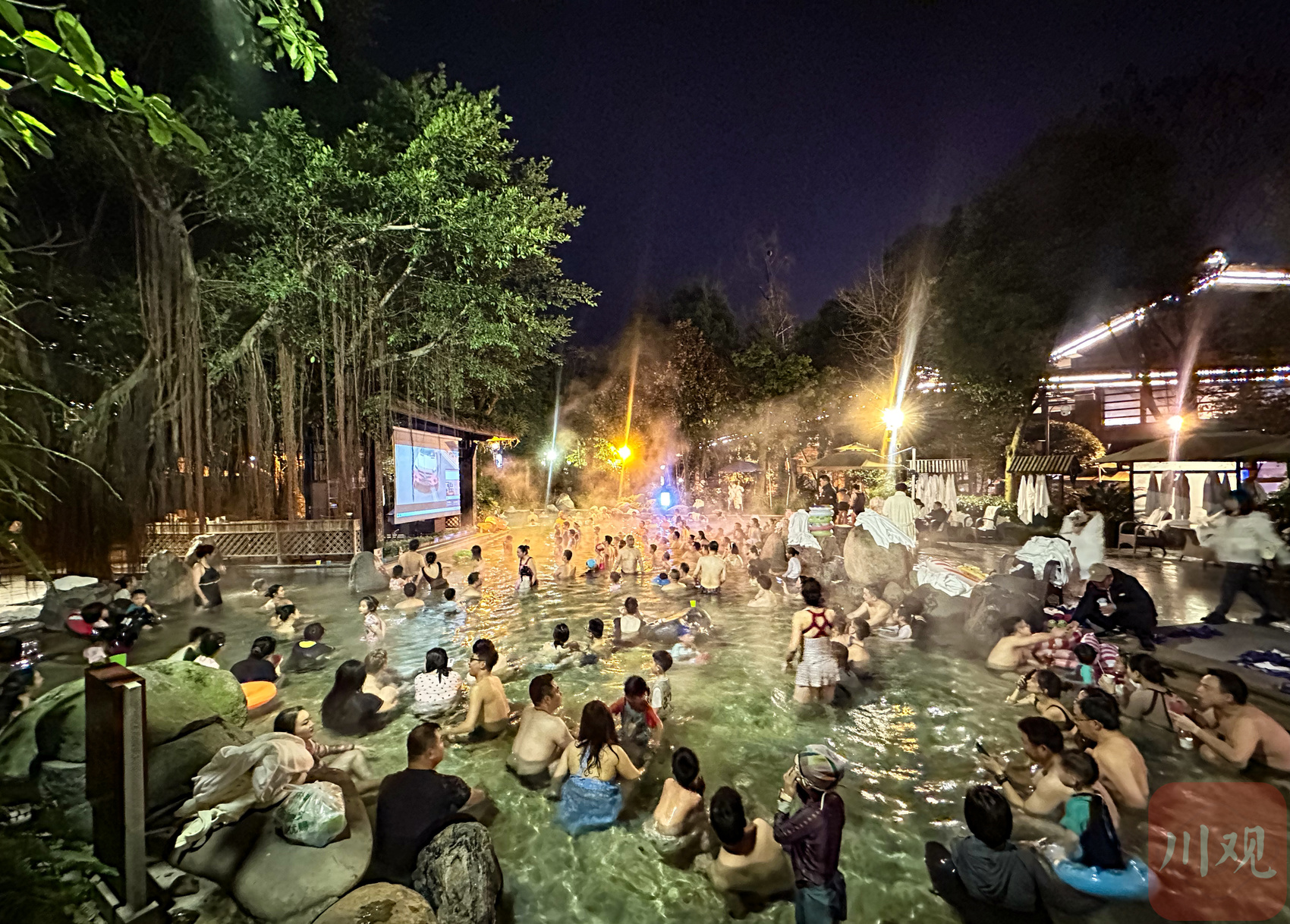 1月23日晚,在成都都江堰市青城山脚下,游客们一边泡温泉,一边观看露天电影。