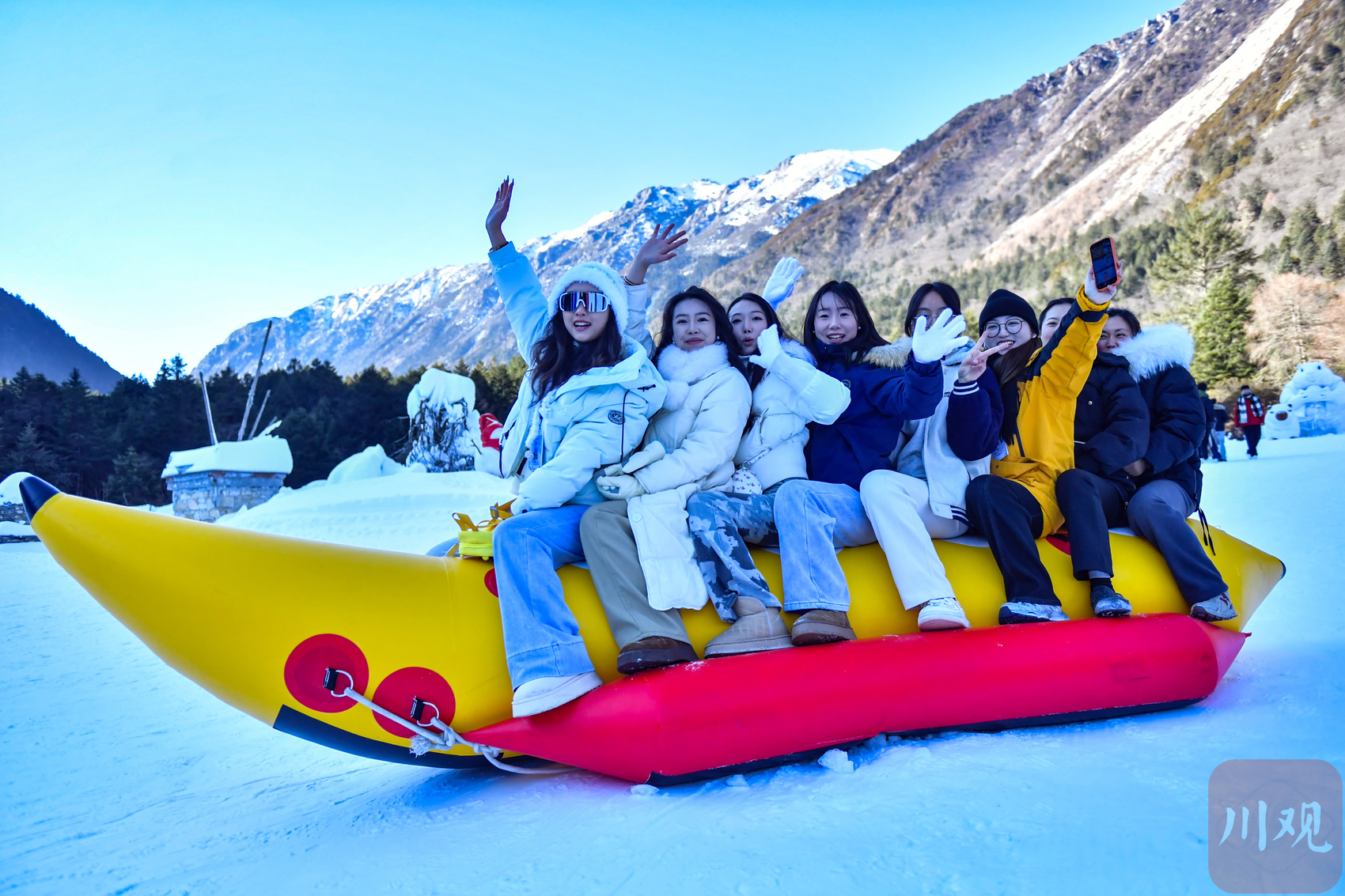 1月23日,游客在康定市木格措景区体验香蕉船滑雪项目。