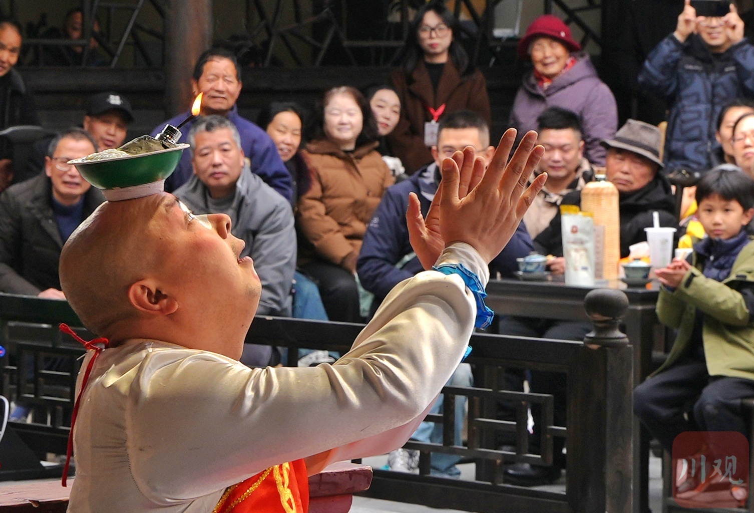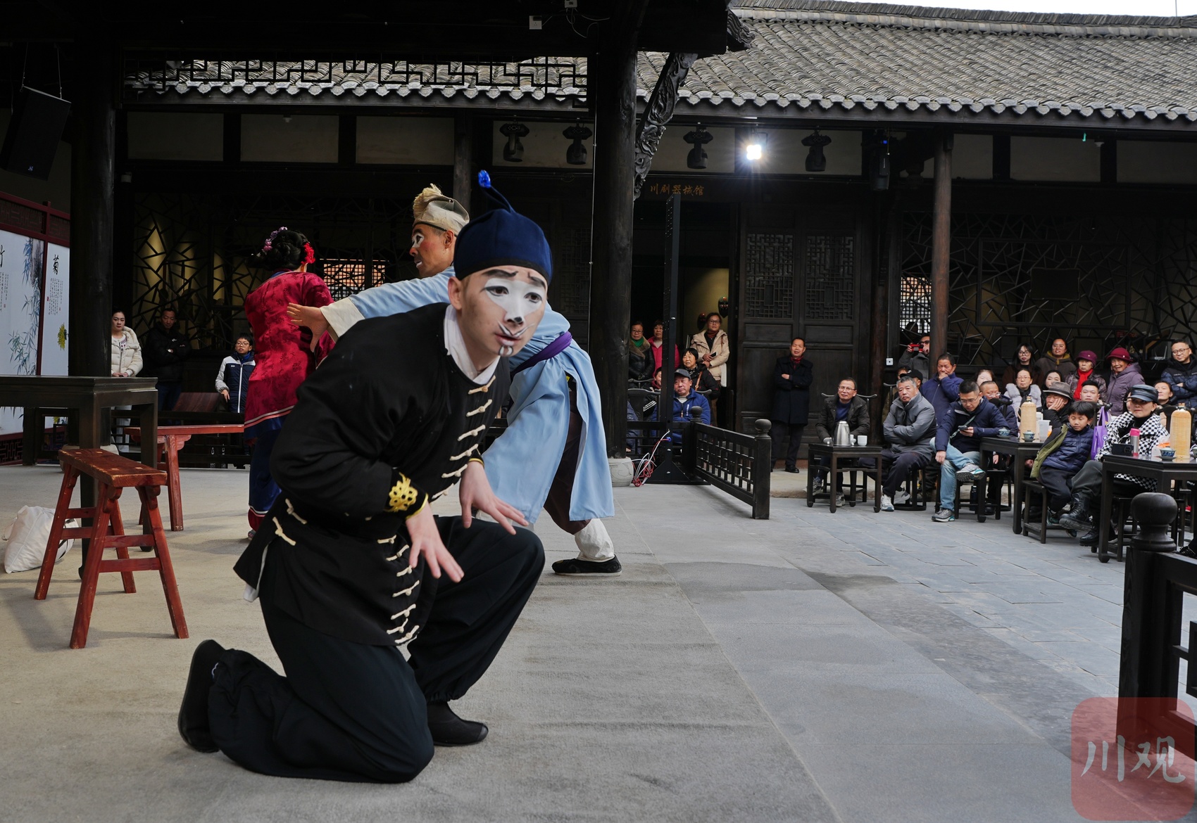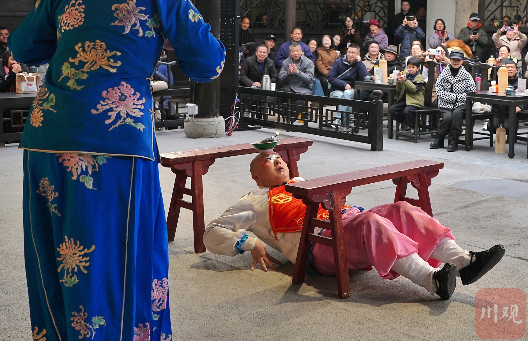 1月25日,成都青白江城厢镇中国川剧文化艺术中心的古戏台上,小锣、小鼓敲响、唢呐声高亢,吸引了众多本地居民与专程赶来的外省游客,同赴共享这场非遗文化盛宴。