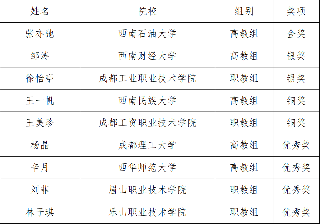 记者1月26日从省教育厅获悉,近日在天津举行的第三届全国大学生职业规划大赛课程教学赛道全国总决赛中,四川高校教师表现亮眼,斩获金奖1个、银奖2个、铜奖2个、优秀奖4个,实现课程教学赛道金奖“零的突破”,获奖总数位居全国前列。