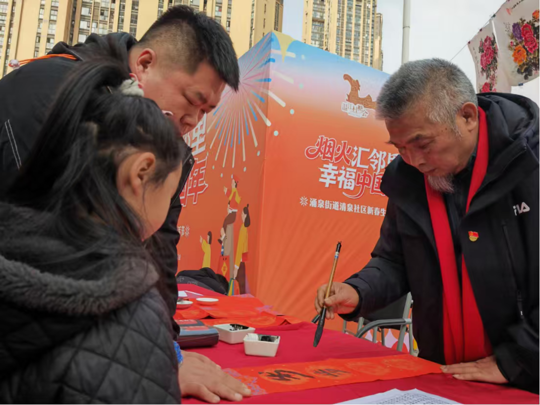 活动伊始,公益磨刀、写春联、音乐暖场等活动便吸引了众多居民驻足。在写春联的案桌前,党龄近50年的天来国际小区流动党员肖洪光和退役军人涂莲萍正挥毫泼墨,为邻居们免费书写新春的祝福。肖洪光表示:“作为一名老党员,离乡不离党,只要大家需要,我还能为社区‘写’点实事,让传统文化在邻里间活起来、传下去。”他的话语朴实却充满力量,这正是社区“亲邻家园”营建理念的生动体现。
