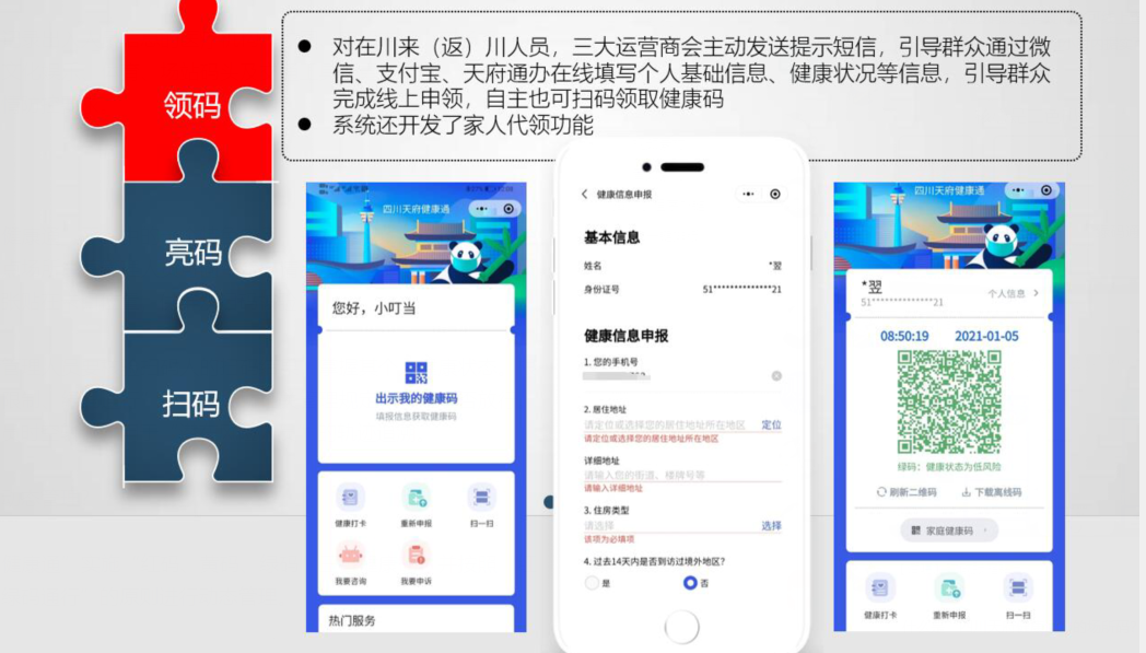 如何领码?四川严格执行国家健康码标准,对在川来(返)川人员,三大运营商会主动发送提示短信,引导群众通过微信、支付宝、天府通办在线填写个人基础信息、健康状况等信息,引导群众完成线上申领,也可自主扫码领取健康码。平台还开发了家人代领功能。