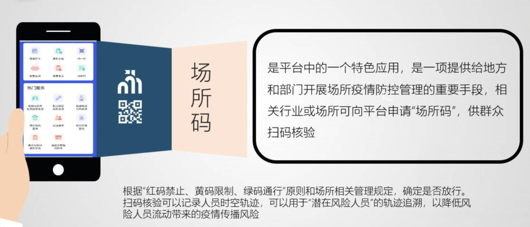 场所码是平台为重点场所赋予(生成)的一个专有二维码,标识了该场所位置、场所名称等信息。群众扫码后,平台自动记录进入该场所的相关信息,这些信息仅用于疫情防控。