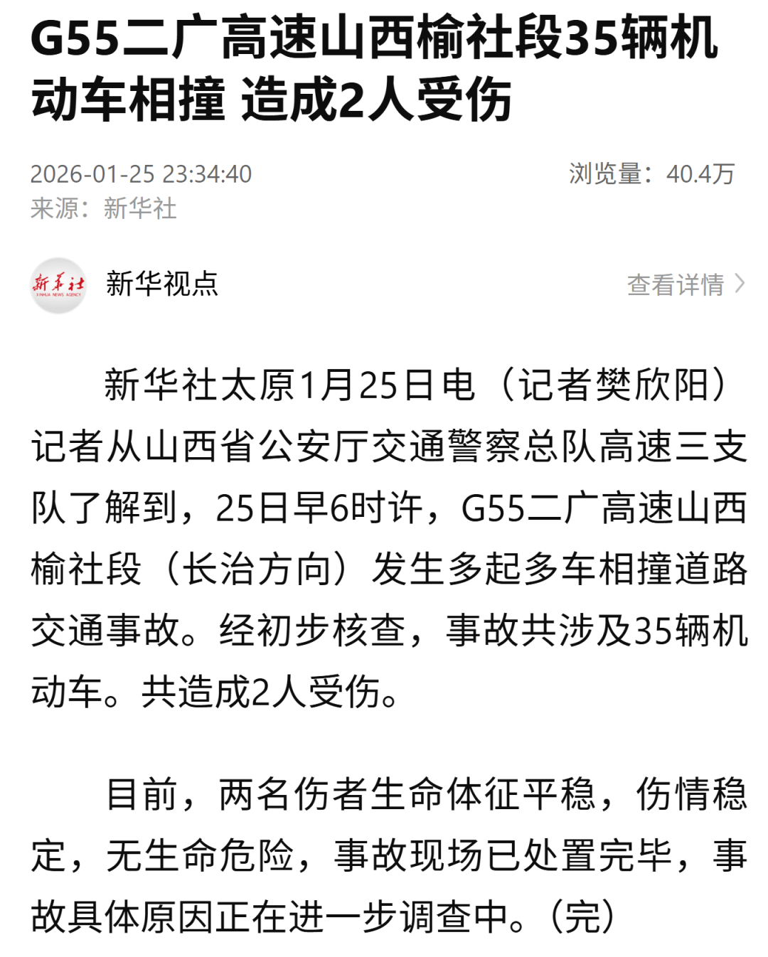 据新华社消息:记者从山西省公安厅交通警察总队高速三支队了解到,25日早6时许,G55二广高速山西榆社段(长治方向)发生多起多车相撞道路交通事故。经初步核查,事故共涉及35辆机动车。共造成2人受伤。